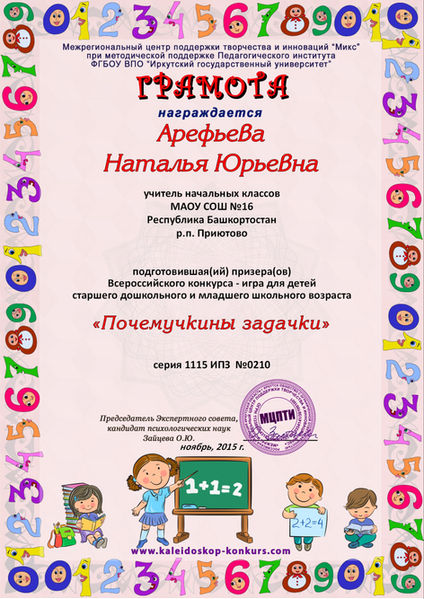 Название курса: «Современные подходы к учебной деятельности младших школьников в рамках реализации ФГОС НОО» (ООО "Московский институт профессиональной переподготовки и повышения квалификации педагогов"; удостоверение №5395)